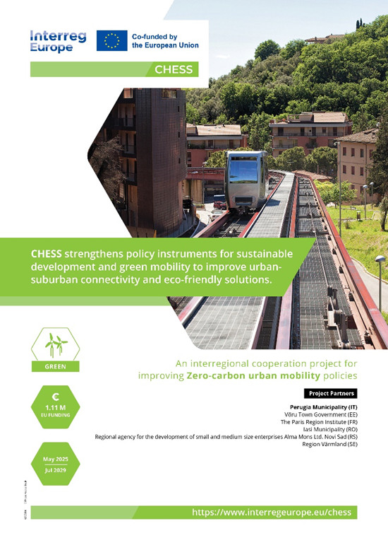 The CHESS project aims to enhance local policy instruments for sustainable urban and peri-urban mobility. The project actions gathers only six partners : Perugia city (Italy), Lasi city (Romania), Värmland Region (Sweden), Võru city (Estonia), Regional agency for the development of enterprises Alma Mons Ltd in Novi Sad (Serbia) and L'Institut Paris Region (France).